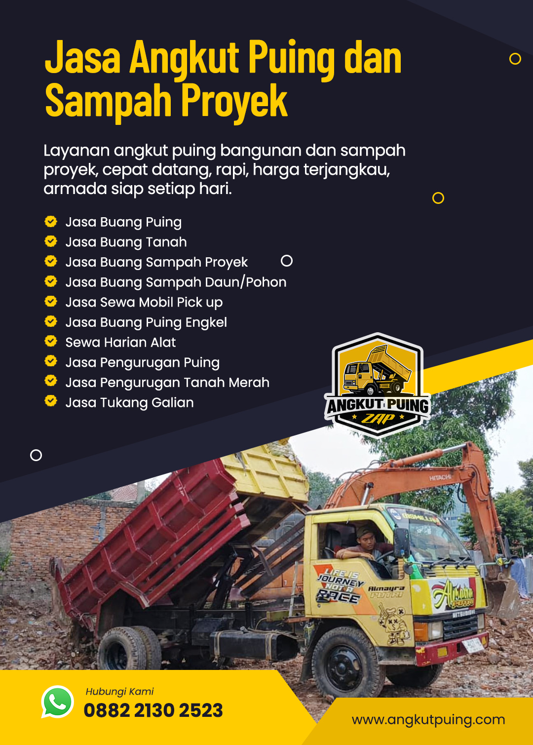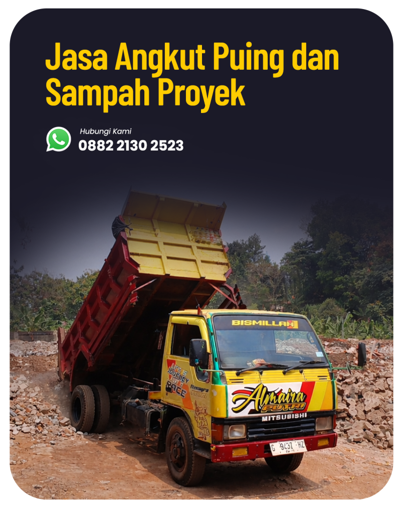 Kami adalah layanan angkut puing bangunan dan sampah proyek yang siap membantu proses pembersihan secara cepat, rapi, dan terpercaya. Setiap pekerjaan kami tangani dengan sistem kerja yang terorganisir agar pelanggan tidak perlu repot mengurus puing sendiri.